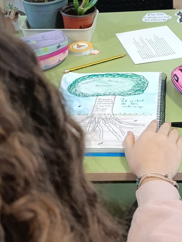 En esta ocasión hemos dibujado «El árbol de los valores», incluyendo en las raíces los valores familiares y del entorno, en el tronco los valores propios y el las ramas los valores que queremos proyectar al mundo.